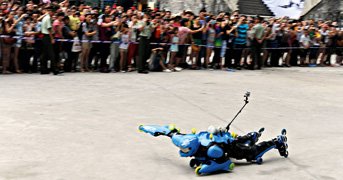 Ele se chama Jean-Yves Blondeau, é francês, tem 42 anos e atende pelo apelido de “Rollerman”. Seu projeto de graduação na faculdade de design industrial tratou da elaboração de uma roupa equipada com rodas de patins, capaz de fazê-lo descer ladeiras deitado, utilizando o próprio corpo como plataforma. Na semana passada, trajando seu melhor modelo (31 rodas distribuídas pelos braços, pernas e tórax), Jean-Yves superou as 99 curvas da montanha de Tianmen, na China. Em alguns trechos alcançou a velocidade de 112 quilômetros por hora.
