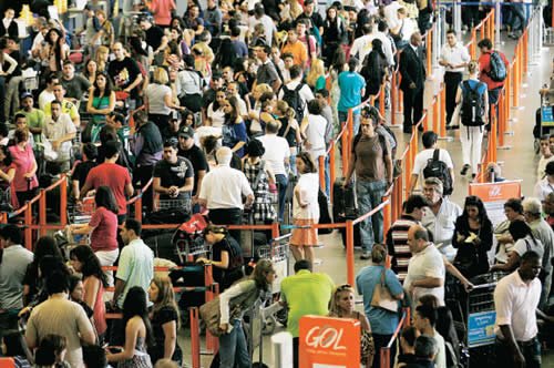 Apesar da Operação Feliz 2009, lançada pelo Ministério da Defesa para evitar longas esperas nos aeroportos brasileiros, quem está viajando nesse Natal precisa de uma dose extra de paciência. Em média, 40% dos vôos decolam fora do horário, segundo a Infraero. A campeã de espera é a Gol com atrasos de mais de meia hora em 46% dos vôos, longas filas no check-in e diversas queixas de passageiros ao Procon, para quem a companhia tem de prestar esclarecimentos.