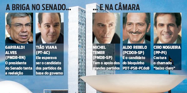 A entrada de Garibaldi na disputa gerou na Câmara uma reação do bloquinho formado pelo PSB, PDT e PCdoB. Os três partidos oscilam em ter em 2010 candidato próprio à Presidência (o deputado Ciro Gomes) ou em disputar com o PMDB a indicação do vice da ministra da Casa Civil, Dilma Rousseff (hipótese reservada para o governador de Pernambuco, Eduardo Campos). Assim, na terçafeira 16, o "bloquinho" resolveu lançar o deputado Aldo Rebelo (PCdoB-SP), ex-presidente da Câmara. E, para completar, Rebelo entrou firmando no dia seguinte um compromisso de apoio recíproco com o deputado Ciro Nogueira (PP-PI), outro candidato que disputará o cargo em fevereiro, contra o nome do PMDB, Michel Temer.