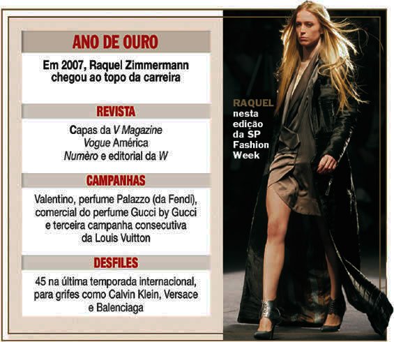 A modelo vive seu melhor momento em dez anos de carreira. Conquistou o primeiro lugar na lista das principais modelos do mundo do conceituado site Models.com, bíblia das tops e, depois de Gisele Bündchen, que hoje está na categoria ícones, é a primeira brasileira a alcançar o almejado posto. A estrela de Raquel demorou a brilhar porque quando ela começou, em 1997, era o momento de mulheres cheias de curvas, como a própria Gisele. “Hoje sou feliz porque consegui alcançar um patamar muito difícil”, diz ela, que surgiu poderosa na passarela da Animale, nesta edição da São Paulo Fashion Week.