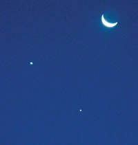 Evento raríssimo ocorreu no céu do Hemisfério Sul na segunda-feira 1: durante uma hora e meia houve conjunção entre a Lua, Júpiter (à esq.) e Vênus (à dir.). Formou-se um triângulo. Segundo astrônomos, outro céu como esse só ocorrerá em 2052.